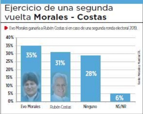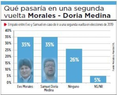 Sin embargo, esa figura cambiaría en caso de darse un eventual balotaje entre Morales y Samuel Doria Medina, líder de Unidad Nacional. Ambos candidatos empatarían con 35%.