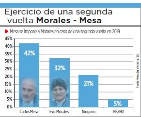 Ante la pregunta ¿Qué pasaría si Evo Morales y Carlos Mesa tuvieran que enfrentarse en una segunda vuelta? ¿por quién votaría? que planteó Mercados y Muestras para Página Siete, un 42% dijo que apoyaría al vocero de la causa marítima. Mientras un 32% votaría por Morales.